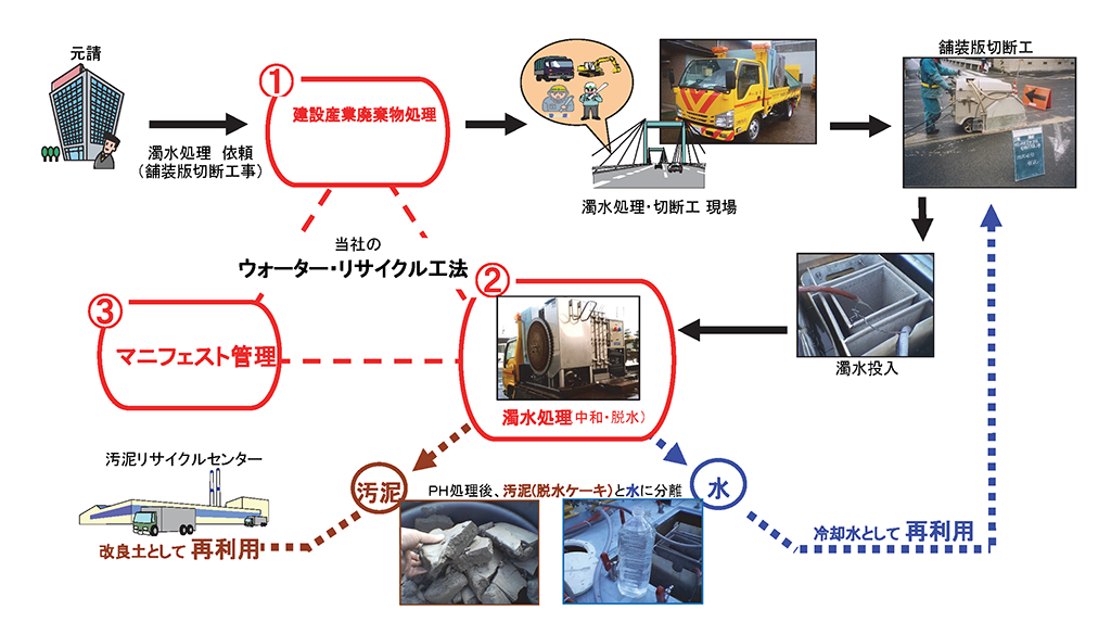 従来、切断時に発生する泥水は、そのまま側溝や用水路等に流していたのですが、この工法は、発生した泥水を回収し、中和・脱水処理をします。脱水後の水は冷却水に再利用し、汚泥はリサイクルセンターへ持込み再生土として再利用します。弊社は移動式中間処分業を取得していますので各現場での処分が可能となり、マニフェスト管理も弊社にて行います。